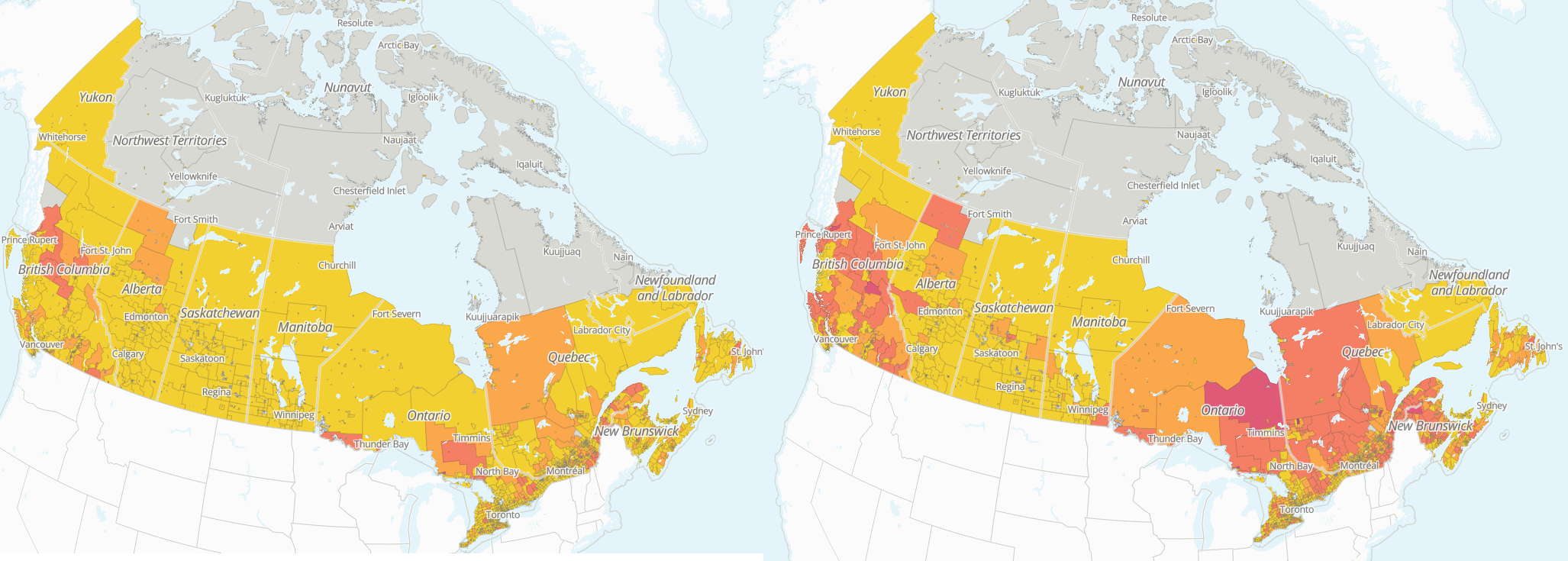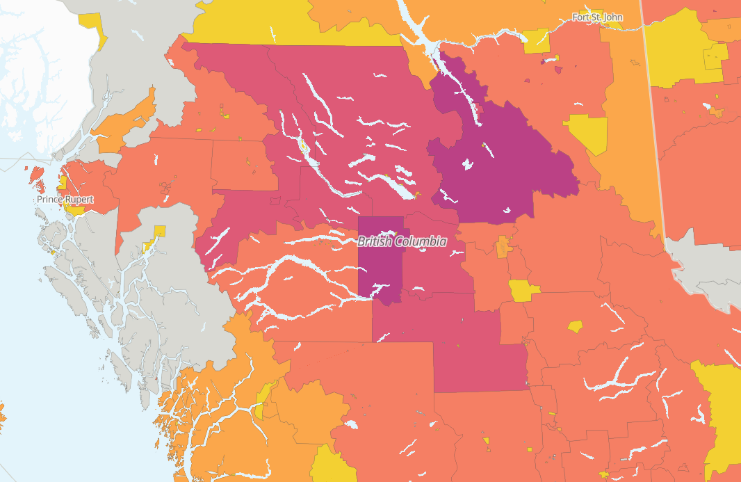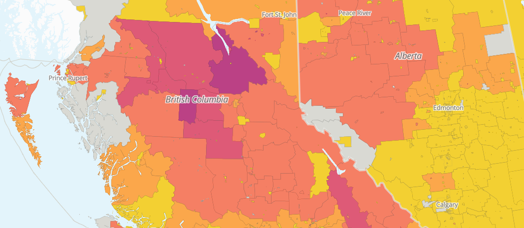 Using our mapping and visualization tool we can trace potential tariff vulnerabilities across Canada. The new softwood lumber tariffs widely affect interior regions of provinces, most notably the B.C. interior, northern Quebec, northern Ontario, and the Maritimes.