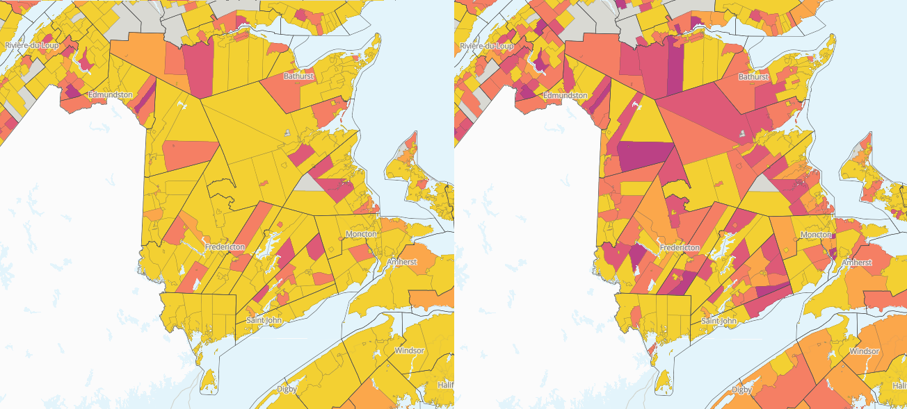Proportion of businesses estimated as vulnerable in New Brunswick by census subdivision.